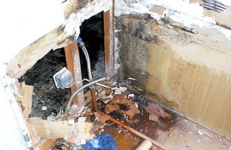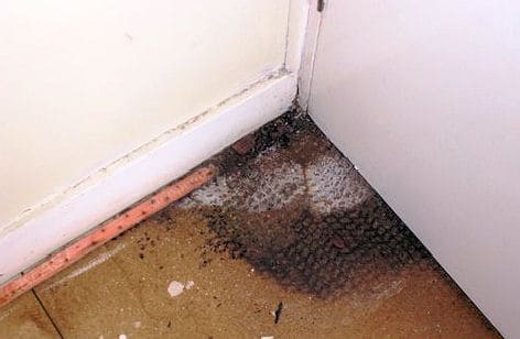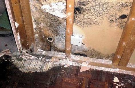 With the bath removed the damage caused by the Wet rot is clear to see. Black mould can also be seen on the wall.