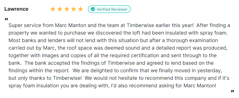 It is worth knowing that should you choose to sell your property, mortgage Lenders are now in some cases requesting surveys of the roofing timbers where spray foam insulation has been removed, to establish if the foam has caused any fungal decay or woodboring insect attack before releasing funds. If you have reason to suspect that maybe your property has been suffering from a poor installation of spray foam insulation, then please give our team a call and arrange a spray foam insulation survey.