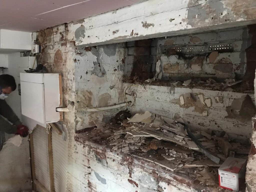 Due to the lack of ventilation and a failed partial waterproofing system, the basement timbers had succumbed to a dry rot attack. Dry rot is a type of wood rot (Serpula Lacrymans) that commonly will only attack damp timber in areas with no ventilation.
