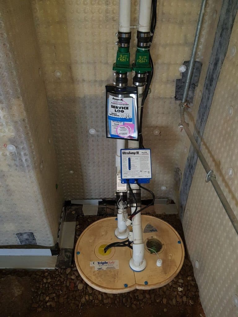 Water flows by natural water migration through perimeter drainage channel to the sump pump drains. The sump pump’s job is to then pump the water out of the pit and away from the building so the basement stays dry.