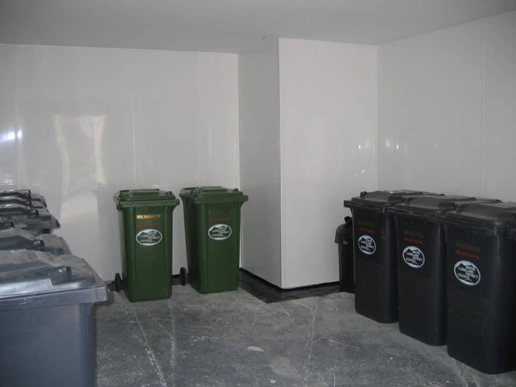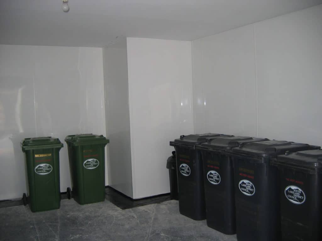 The client also required a clean and robust wall finish which would withstand the impact of wheely bins. We proposed and installed white PVC panels to the walls which act as a moisture and water barrier, creating a cavity between these panels and the solid walls allowing water to flow into the channels at their base. The panels give a clean surface that can be easily washed down to stop the build-up of bacteria, perfect for a communal bin store.