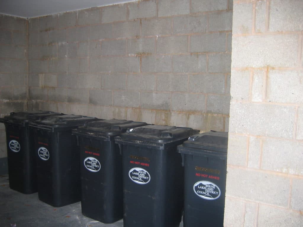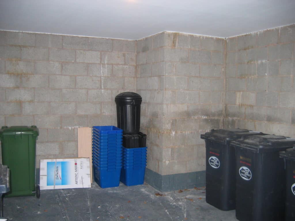 The Mountain Ash Court development featured a wheelie bin store that was built underneath the apartments allowing easy access for residents to place their waste items. The walls of the store were built directly into the ground with insufficient waterproofing to the structure. Upon completion of the development, the residents found there was pooling water entering the bin store making it impossible to place their waste into the bins inside the storeroom without standing in water that had collected.