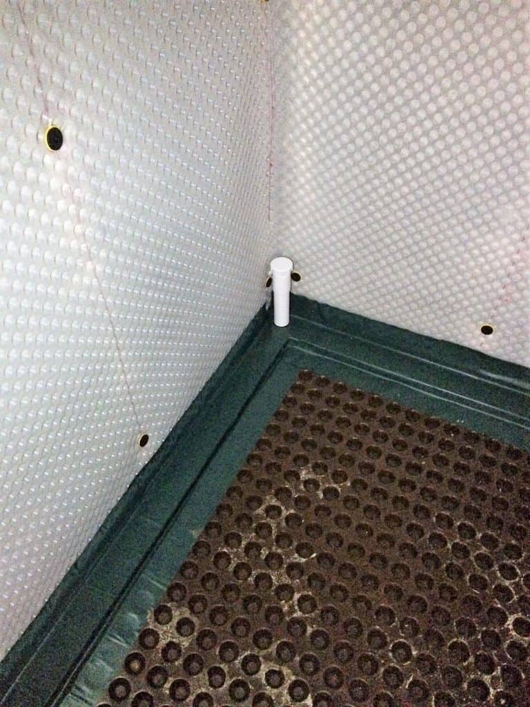 Products Used: cavity membrane, perimeter drain channel, Koster NB1 waterproofing slurry