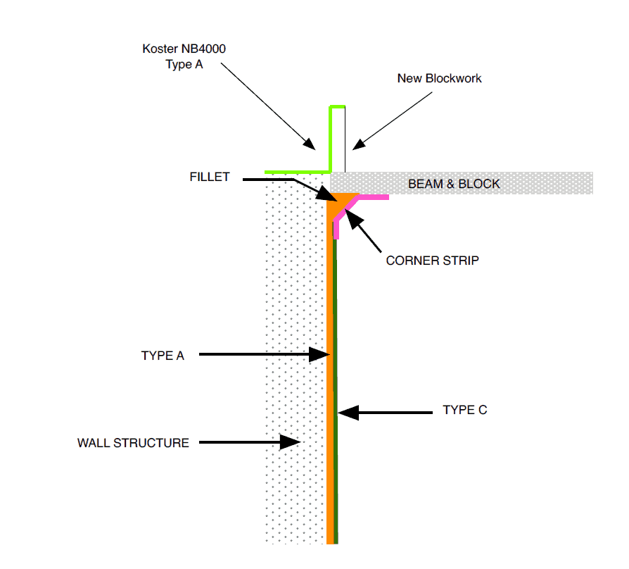 Externally Koster NB1 waterproofing slurry was applied to the brick upstand from the beam and block up to 300mm to the perimeter as indicated on the plan. Koster NB1 was internally applied to the concrete block substrate to provide the first waterproofing barrier, and to conform to the Premier Warranty Chapter 6.1.