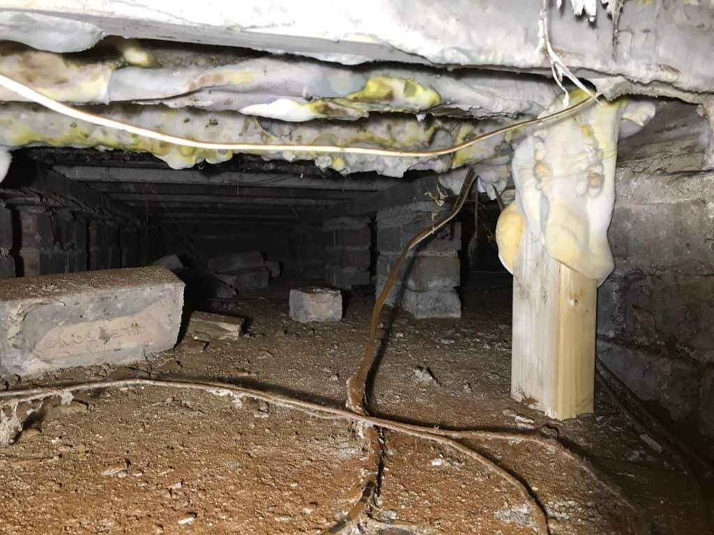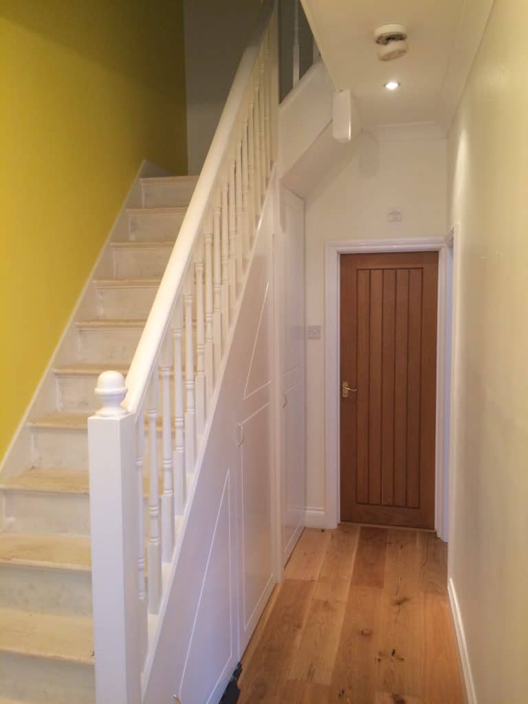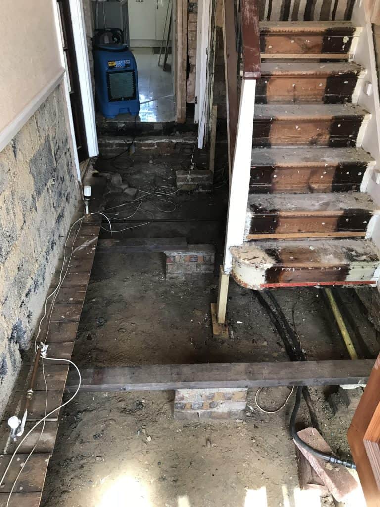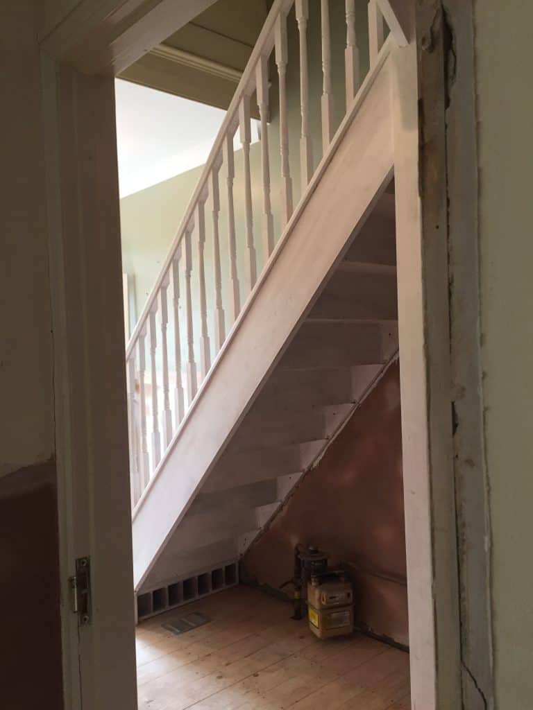 Where the works described in this work involve a party wall, Timberwise had a lawful duty to bring to the customer’s attention to the fact that the party wall act 1996 applied. This meant, as dry rot infection has occurred to the party wall, the client had to speak with the neighbouring property to inform them of the outbreak, that adjacent side (Property B) should also be checked and treated to ensure full eradication has been achieved. Within Property B fungal decay was also revealed below the floorboards in the hallway and beneath the stairs, spore dust also thickly covered the kitchen floor.