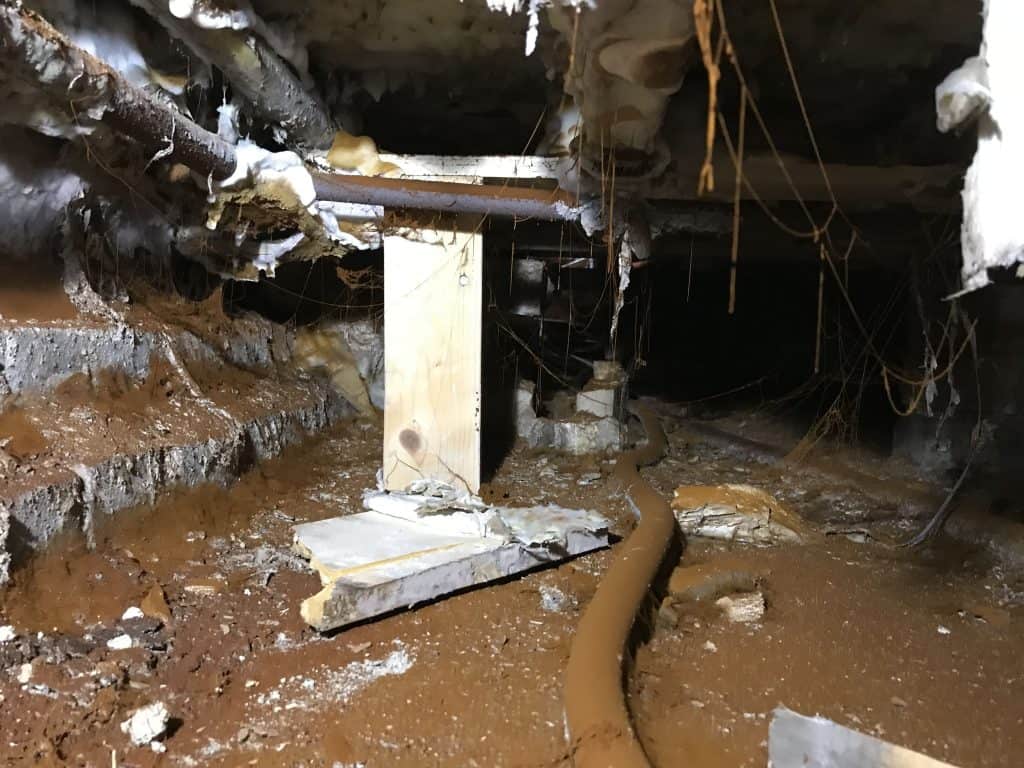 Once the subfloor void was exposed in Property A it was clear that the mycelium (the dry rot strands) was tracking under the floorboards, doorframe and other adjacent areas. Cuboidal cracking and shrinkage were noted to the door frame of the bathroom as well the door frame leading through to the lounge.