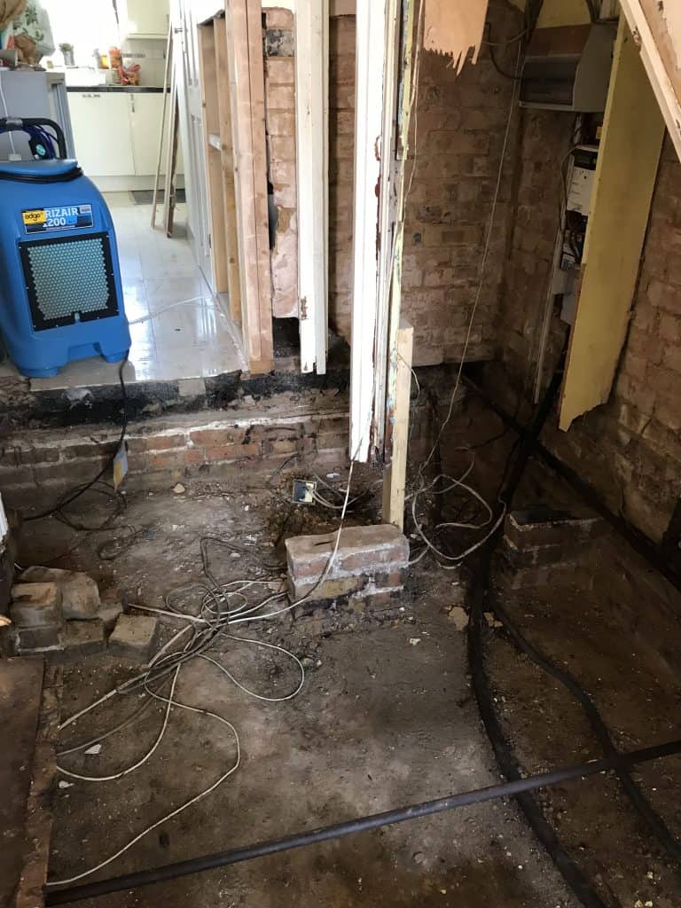 The scope works included hacking off all adjacent plaster back to the brickwork and removing the resultant debris, all skirting, architraves, floor structure and associated timbers within 500 mm of the dry rot outbreak. As a precautionary measure, to ensure there was no mycelium present, the doorframes were removed and the stud work exposed.