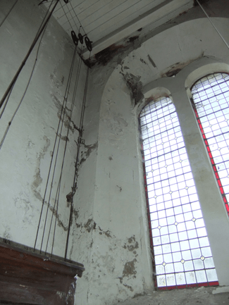 The dry rot repairs included replacement of two timber levels within the tower. Where timber was decayed as a result of the dry rot or dampness, such as bearing end sections, the sections were removed and replaced with newly treated timbers. Fungicidal paste and fluids were used to treat remaining timbers, such as floor timbers and bearing ends, when the walls dried they were re-plastered in lime plaster. The Nave lime plaster ceiling, which was failing due to a defect in the spacing of timber laths, was also replaced.
