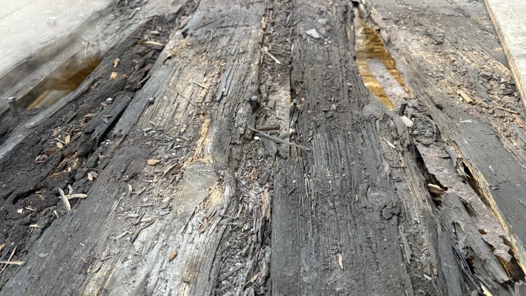 Wet rot and woodworm were found to be present in 3 places on the first floor of the building. One section was in the roof purlins and wall plate, and the other 2 sections were in the upstairs floorboards and joists.