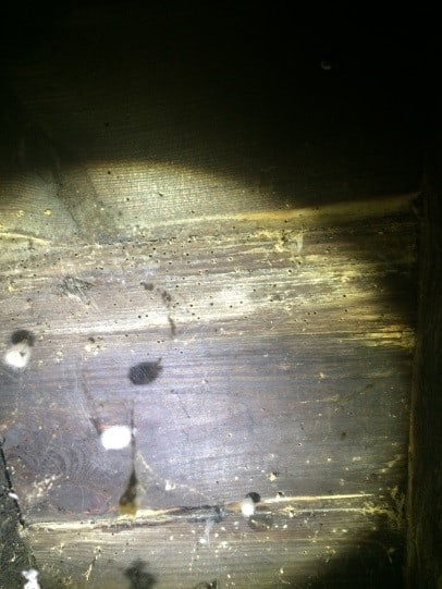 Woodboring Weevil, on the other hand, tends to a smaller insect, known for its long snout and most commonly found on damp skirting boards and embedded joist ends. Whilst inspecting the area of the cellar and underside of the ground floor Timberwise acknowledged that while some timber renewals and dark stain protection to the joists had already been applied, the active woodworm still remains in some flooring to the adjacent flat.